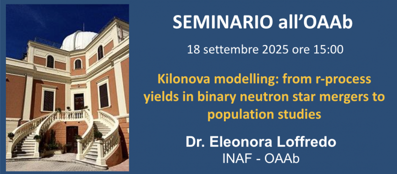 Giovedì 18 settembre aprile alle ore 15:00, la Dott.ssa Eleonora Loffredo, dell’INAF-Osservatorio Astronomico d’Abruzzo, terrà il seminario dal titolo “Kilonova modelling: from r-process yields in binary neutron star mergers to population studies”.