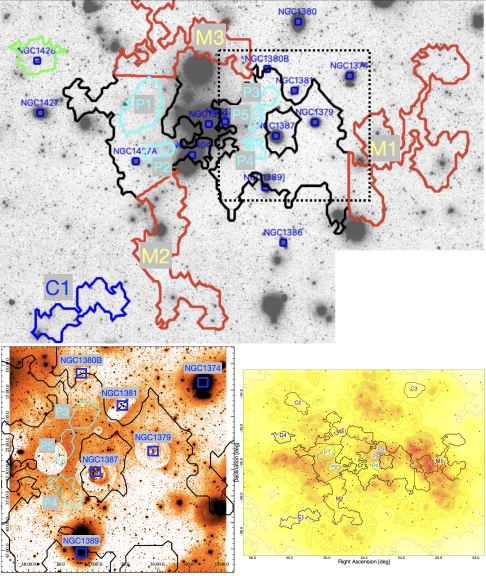 Pannello in basso a sinistra: mosaico VST di una regione del nucleo dell’ammasso di Fornace, dove sono state individuate strutture diffuse di luce ‘intracluster’ (E. Iodice et al. 2017). I contorni mostrano le strutture e i massimi di densità nella distribuzione degli ammassi globulari. Per mettere in evidenza queste deboli componenti, le galassie più luminose sono state modellate e rimosse dall’immagine.
