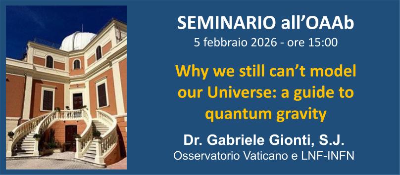 Giovedì 5 febbraio alle ore 15:00 Gabriele Gionti, S.J. (Vatican Observatory e LNF-INFN) terrà un seminario dal titolo “Why We Still Can’t Model Our Universe: A Guide to Quantum Gravity”. ABSTRACT: Einstein’s General Relativity is a highly successful theory for describing the universe at solar system, galactic and extra-galactic scales. However, it encounters fundamental limits at […]